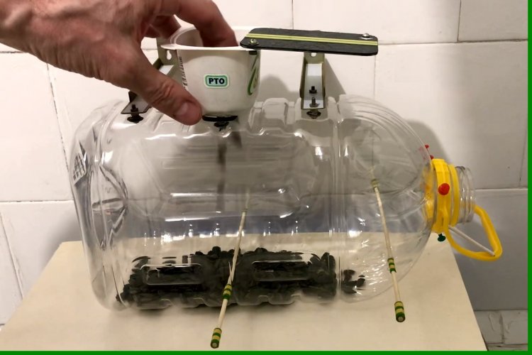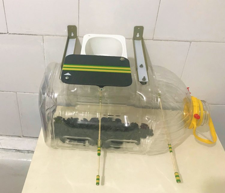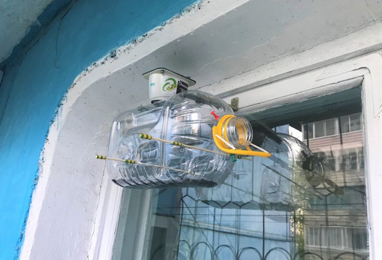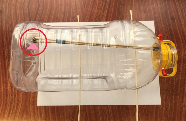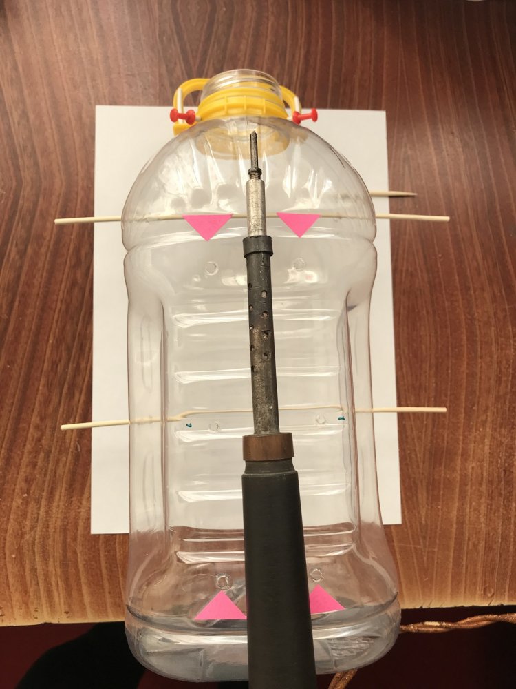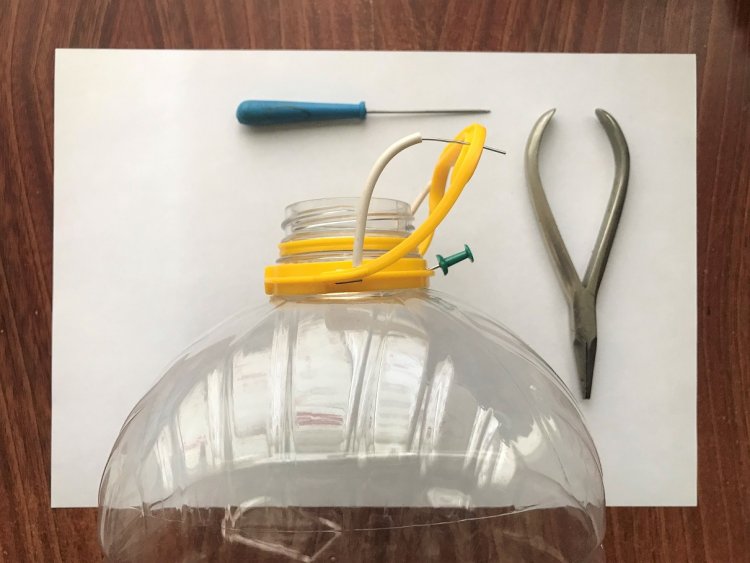 Скрепки вставляются в проколотые шилом отверстия и изгибаются с помощью плоскогубцев. Для того, чтобы жёлтая входная жёрдочка не вращалась вокруг горлышка бутыли, в её основание вкалываются цветные канцелярские кнопки-гвоздики.