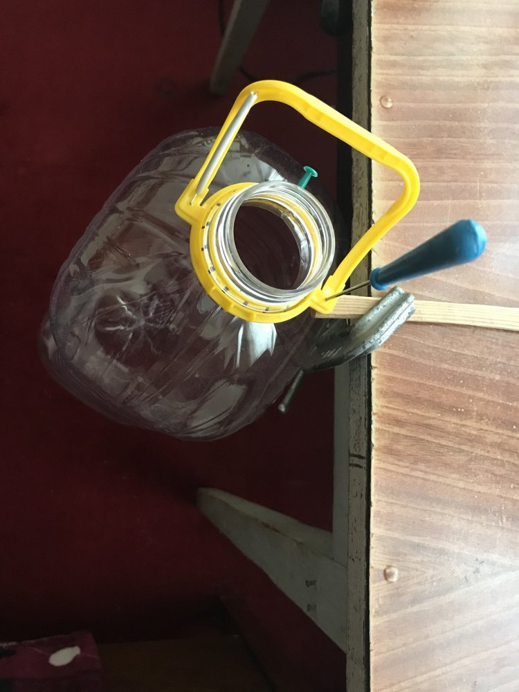 1). Двух- или 4-литровая пластиковая бутыль из-под сокового напитка. В них продаются брусничные, клюквенные, грушевые и другие напитки по цене 180 … 220 рублей за штуку. Жёлтая эластичная ручка для переноски бутыли несложной доработкой превращается во входную жёрдочку КМП.