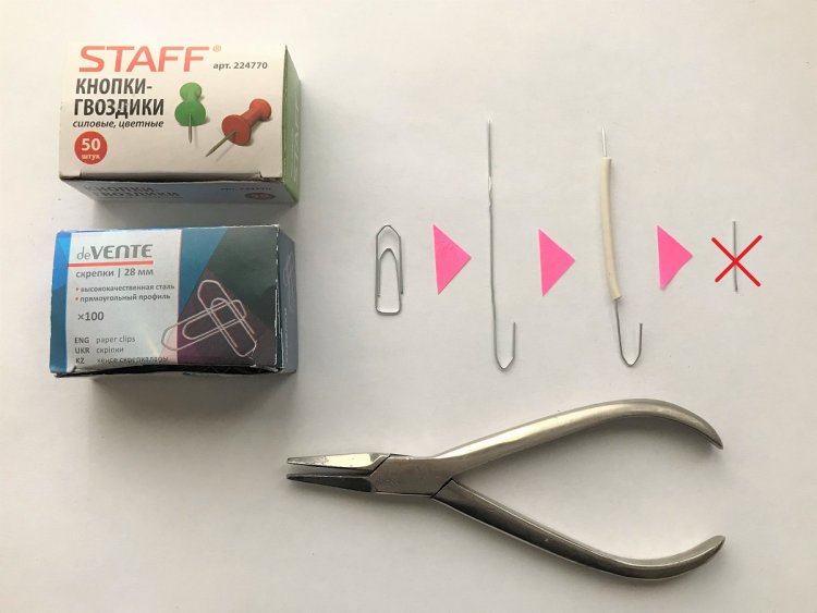 8). Скрепки канцелярские (например, de VENTE 28 мм. из высококачественной стали) из проволоки диаметром 0,8 … 1 мм. – 2 штуки.