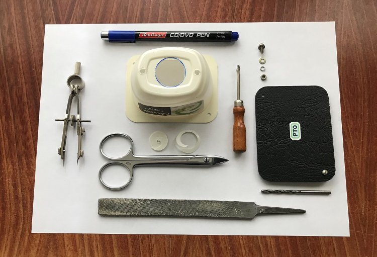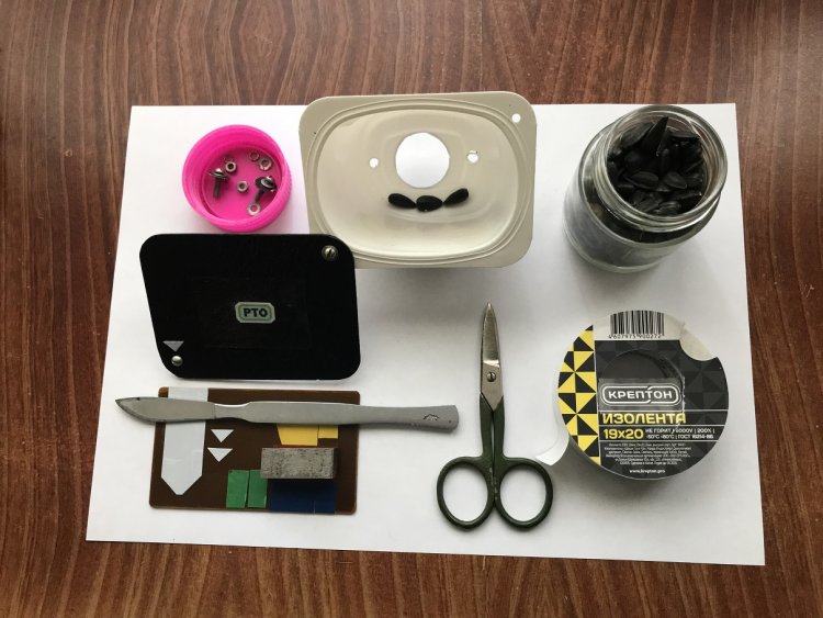 Крышка воронки вырезается из тиснённого чёрного пластика толщиной 2-3 мм. Подойдёт также тонкослойная авиационная фанера. Крышка имеет размеры 92х70 мм. Края крышки скруглены по форме баночки «Даниссимо» на личном и бархатном плоских напильниках. Для разметки отверстий (3,2 мм) в крышке, можно использовать баночку «Даниссимо» в качестве трафарета. Крышку можно «украсить» рисунком – этикеткой «РТО» или пятью другими этикетками, распечатанными из файла KMP_4work.