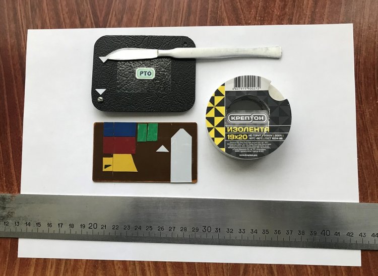 Чтобы вырезанную из изоленты фигурку наклеить на крышку воронки аккуратно, фигурку скальпелем отделяют от гетинаксовой платы, приклеивают на кончик скальпеля, перемещают и в нужном месте прижимают к крышке пальцем. Скальпель аккуратно (чтобы не растянуть изоленту) выдёргивают из-под фигурки. Далее можно полюбоваться на сделанное и получить заслуженное удовольствие от качественно выполненной операции. Также можно уточнить (улучшить) местоположение фигурки. Клеящий слой изоленты «Крептон» позволяет изменить (переклеить) местоположение фигурки до нескольких раз.