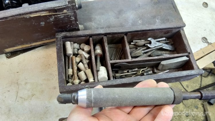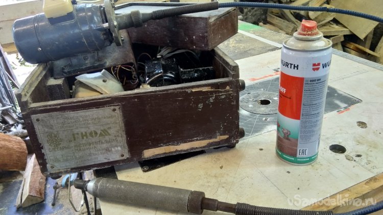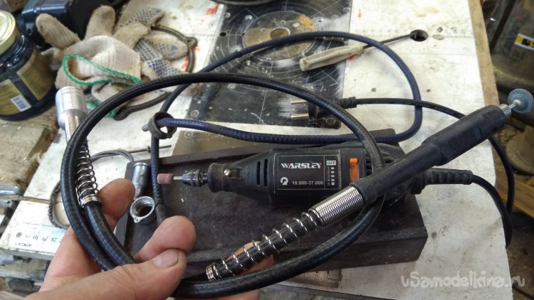 Сделал по-быстрому. Подключил провода, моторчик, гибкий вал. Моторчик 8000 оборотов и 60 ватт. Крутит быстро, но под нагрузкой обороты падают, громко жужжит. В оригинальной поставке был регулятор оборотов, но его чинили жёстко, совсем мне его восстанавливать не хочется, он тем более просто на отсечку работает, стабилизации оборотов нет.