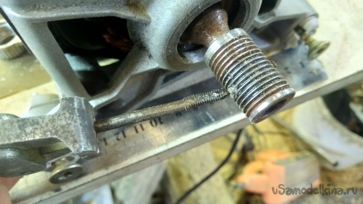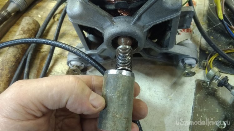 В отверстиях нарезал резьбу и винтами без головок фиксирую гибкий вал на моторе. Впоследствии использовал М4 с обычными головками. Они, напротив друг друга и дисбаланс не вносят.