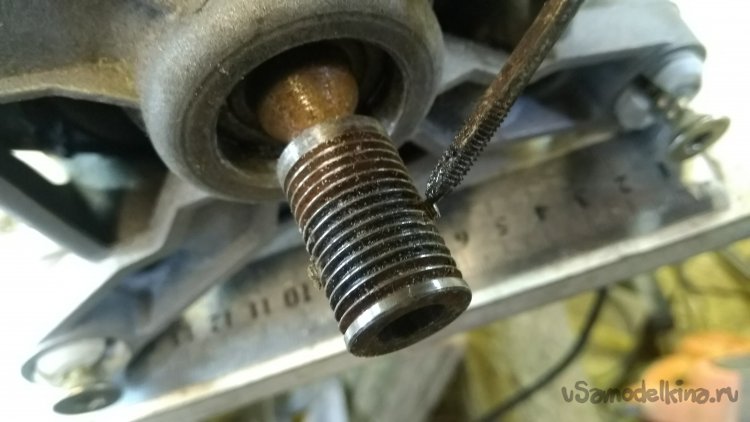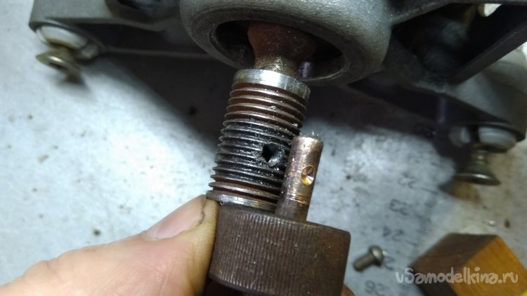 Трёхмиллиметровые винты, фиксировавшие тросик от прокручивания, заменил на М4. Во втулке просверлил углубления для фиксации этими винтами. На кончиках винтов сделал проточку конусную, чтобы при упоре не расклепалась резьба на болтах и их можно было при необходимости выкрутить.