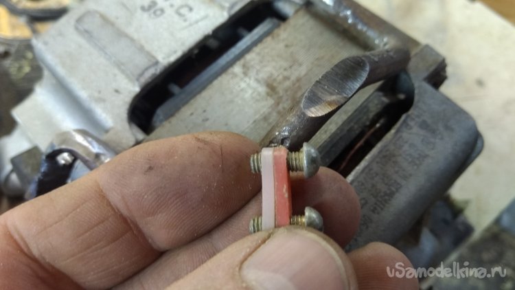 Для лапок сгодятся винты М4, большего диаметра побоялся использовать, не знаю какого диаметра там заклёпки, на которых держится мотор.
