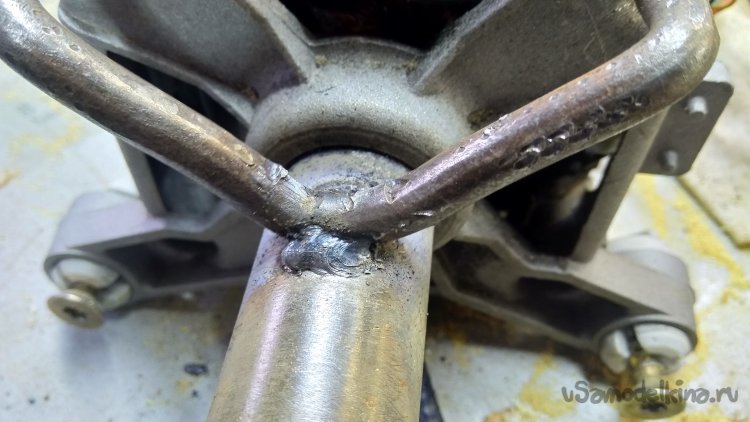 Лапки становятся кронштейном, теперь надо приварить трубу к кронштейну.