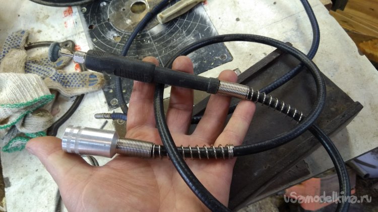 Гибкий вал применён от привода спидометра, с небольшой переделкой, но там гибкий вал левого вращения, а мотор и фрезы правого вращения. Вал довольно быстро скрутился внутри оболочки и заклинил. Еле удалось его извлечь. В магазине найти нужный гибкий вал не удалось, там все левого вращения, купил что есть. Похоже что от Газели.