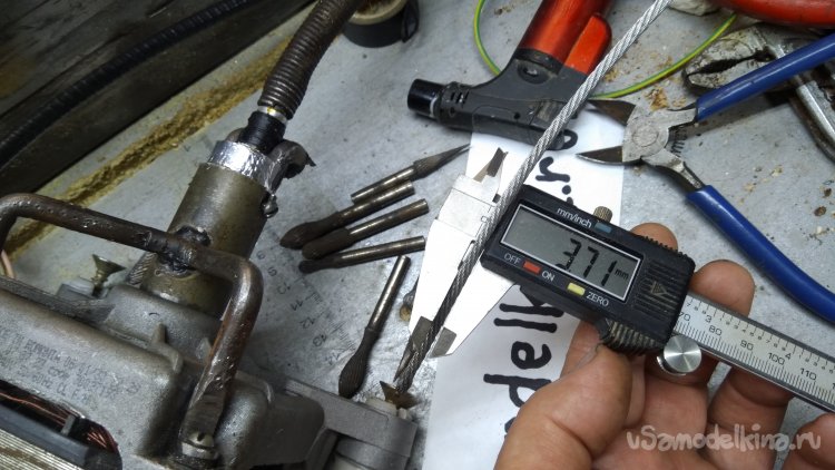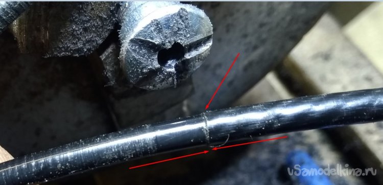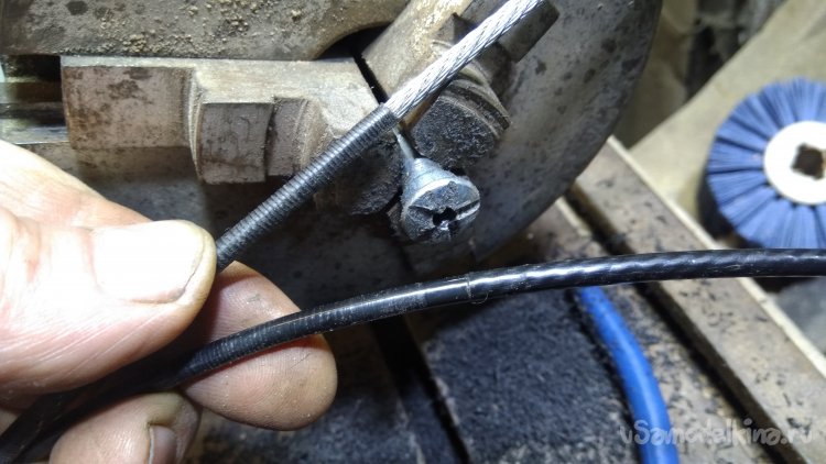 Новый тросик правого вращения, но на нём капроновая оболочка, в старую оплётку он не лезет, поэтому сделал резак для калибровки диаметра.