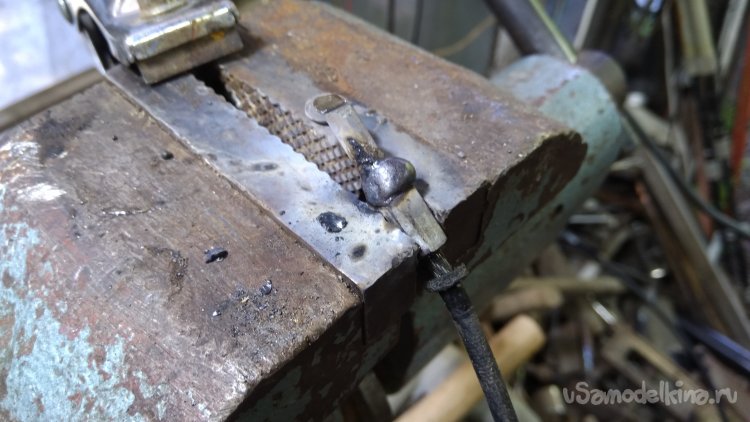На одном конце тросика было повреждение. Отпилил болгаркой, на другом конце опрессовка на квадрат трубочкой стальной. Но размер великоват для моих целей, и коротковата эта опрессовка. Электросваркой приварил кусочек металла, использовал стальную заклёпку 5 мм диаметром. Отпрессованную трубочку зажал в тиски, чтобы не перегреть тросик, тиски как теплоотвод.