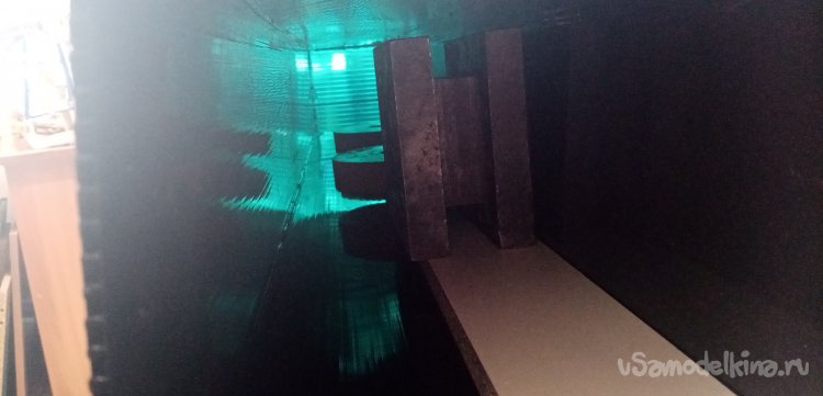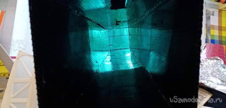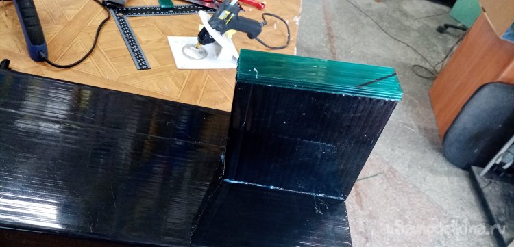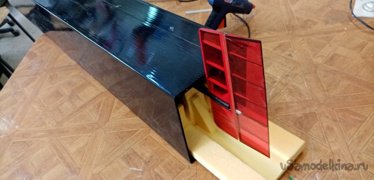 Из толстого прозрачного вырезаю торцевую стенку и приклеиваю по месту.