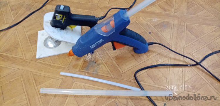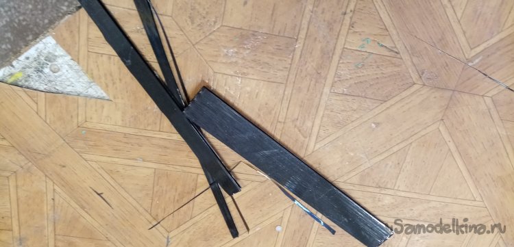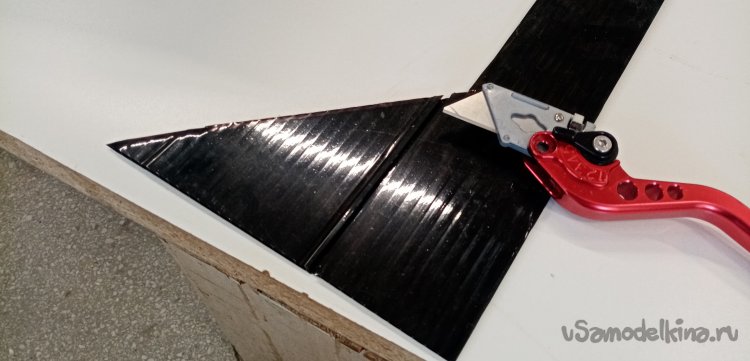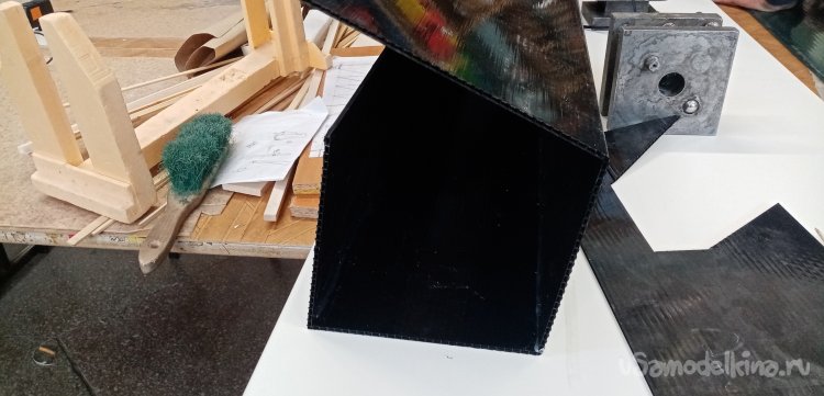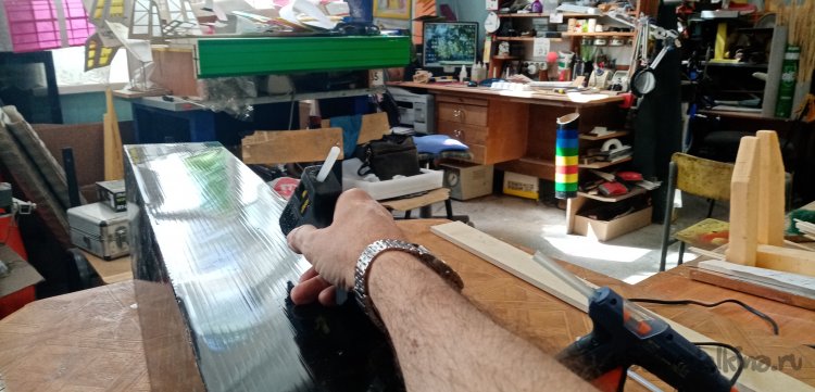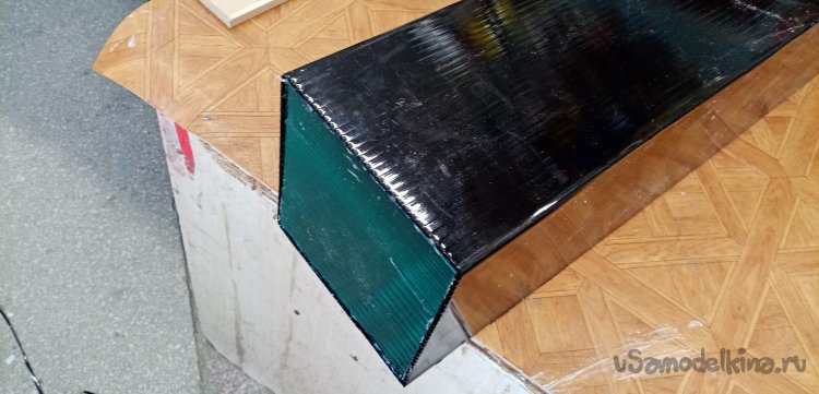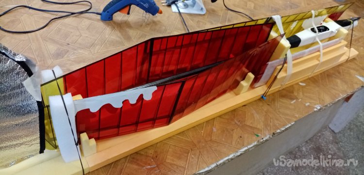 Планер закреплен на выдвижном стапеле, начинаю обмер и разметку пластика. Белого фломастера к сожалению не оказалось в моделке, наношу риски при помощи черного. Видно, но с трудом. Разметка облегчается сотовой конструкцией материала. Очень аккуратно вырезаю одну стенку ячейки поликарбоната по всей длине заготовки. При помощи большого термопистолета заполняю ложбинку клеем, сгибаю под девяносто градусов и жду застывания.