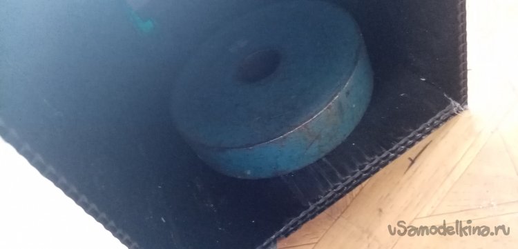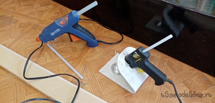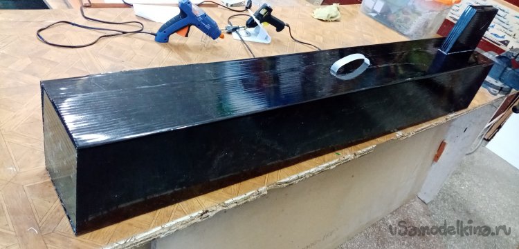 Сейчас самая трудная процедура, нужно приклеить по плоскости два верхних слоя пластика. Использую маленький пистолетик, о дает большую температуру разогрева клея. Времени на нанесение и соединения поверхности должно хватить. Немного разгибаю уже склеенную коробочку, чтобы подлезть пистолетом между верхними слоями и начинаю нанесение. Поскольку стержни у пистолетика маленькие в семь миллиметров, парочку держу в руке, вставляю по мере расходования. В бодром темпе переворачиваю коробочку склеенной стенкой вниз, вставляю заранее приготовленную планку, укладываю груз. Задвигаю внутрь пенала, добавляя железок.