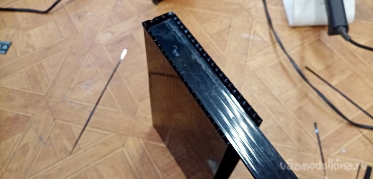Последним вариантом попробовал термоклей из пистолета, хотя скепсис определенный был. Склеилось очень хорошо, попытка разорвать соединение руками не удалась. Следующая задача чисто технологическая, как согнуть пластик ровно и красиво. Начинаю эксперименты. Поскольку строение плитки напоминает картон, продавливаю внутренний контур и пытаюсь согнуть, под 90 градусов стенку и желательно красиво. Не удалось, вдавленная стенка не деформировалась, как бумажная и сгиб ушел в сторону. При дальнейших усилиях лопнула внешняя грань пластика. Вторая попытка, прорезаю внутреннюю стенку, тоже самое. И третий вариант , полностью вырезаю внутреннюю стенку по длине ячейки. Попытка удалась. Наливаю термоклея в канавку , сгибаю и жду остывания. Заклеился сгиб очень прочно, внешняя грань получилась красивая и четкая.