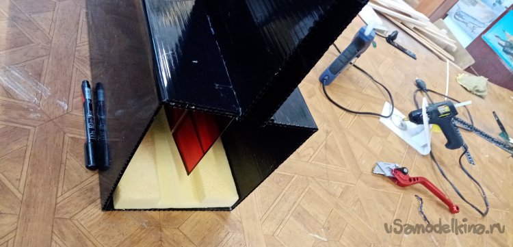 Для фиксации планера изготовляется стапель, в который он устанавливается при транспортировке. По размерам стапеля делаю коровку, в которую конструкция вдвигается. В поле коробку можно даже не вынимать из машины. Снимаю заднюю крышку, выкатываю стапель с планером и можно собирать. Этот вариант пенала изготовлен из утеплителя ПЕНОПЛЕКС толщиной в двадцать миллиметров, оклеен скотчем. Собран на клею титан, склейка усилена зубочистками.