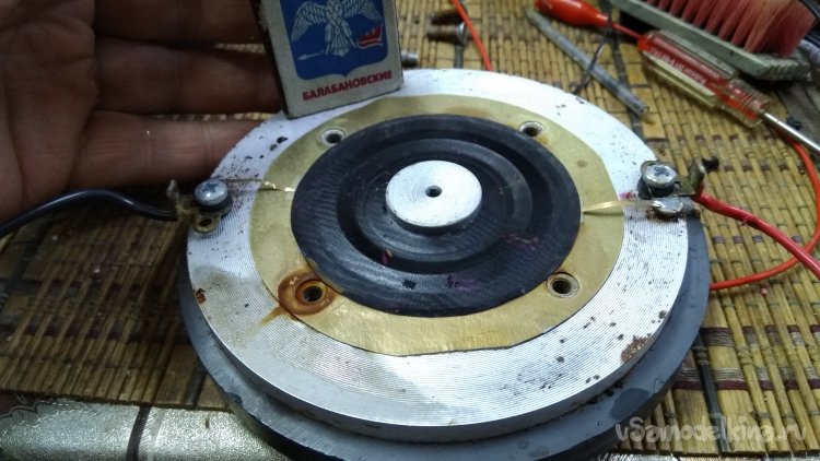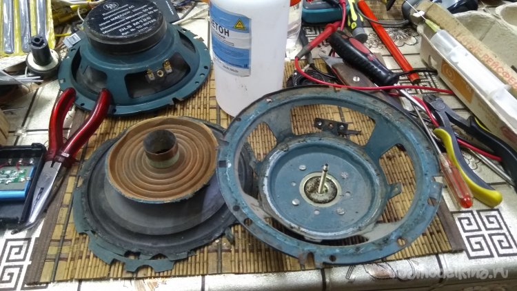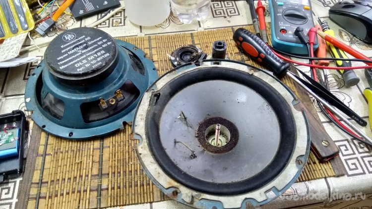 Динамик DLS-M126 для очистки от стружек металлических в магнитном зазоре, решил разобрать совсем. Там и диффузор был надорван. Расклеивал ацетоном, предварительно отпаяв и сняв пищалки, закреплённые на центральном керне магнитопровода.