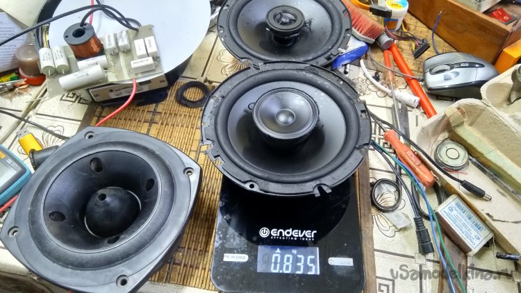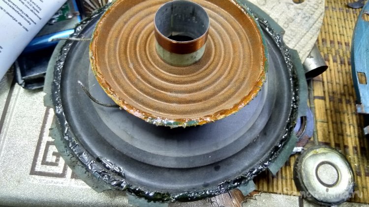 Проверка без акустического оформления вообще не корректна, но я послушал как звучат, прогнал свип-генератором на мощности близкой к максимальной, заменил пищалки. В общем вполне удовлетворительно для 16 сантиметрового динамика. Проверил в комплекте с низкочастотным динамиком, даже на мой слух приемлемо, но стали заметны искажения которых раньше не слышал на более простых динамиках. MP3-плеер оказался не так хорош как его хвалили. Попробовал другие источники сигнала. В результате пришёл к выводу что ноутбук выдаёт более честный звук чем Nokia 6 или все мои MP3-плееры. Вот на нём видимо и буду строить бумбокс для огорода, столярной мастерской и вообще и в мир и в пир )) Но это уже будет потом, пока про ремонт динамиков.
