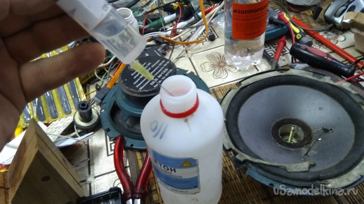 Клей сохнет быстро, поэтому надо сразу всё подготовить для сборки динамика и припаять провода для подключения к усилителю.