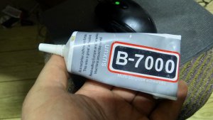 Итак, всё готово, наношу клей, я использовал B-7000 , он применяется для приклейки тачскринов телефонов, однако и на другие цели прекрасно подходит. Быстрое схватывание и отсутствие ползучести при дальнейшем высыхании как нельзя более подходит. Плюс его долговечность, не пересыхает и остаётся эластичным, каучукоподобным.