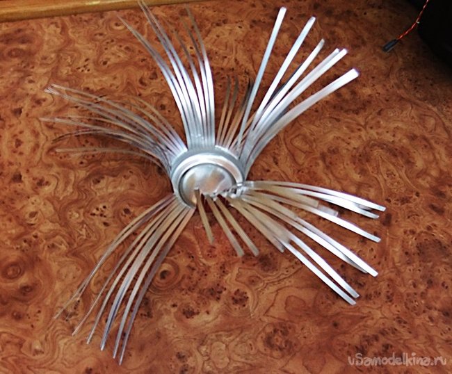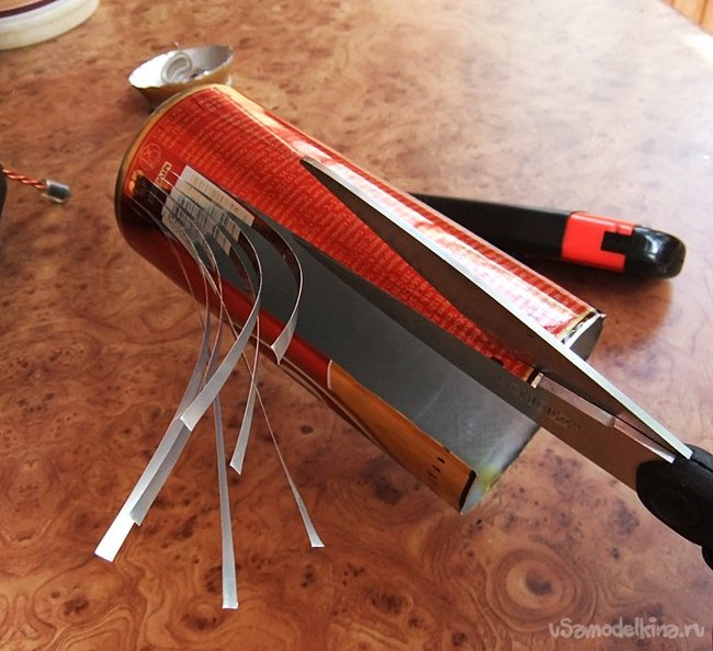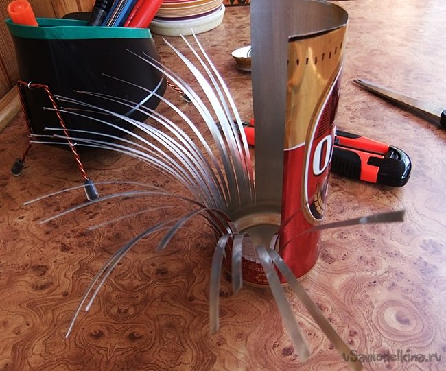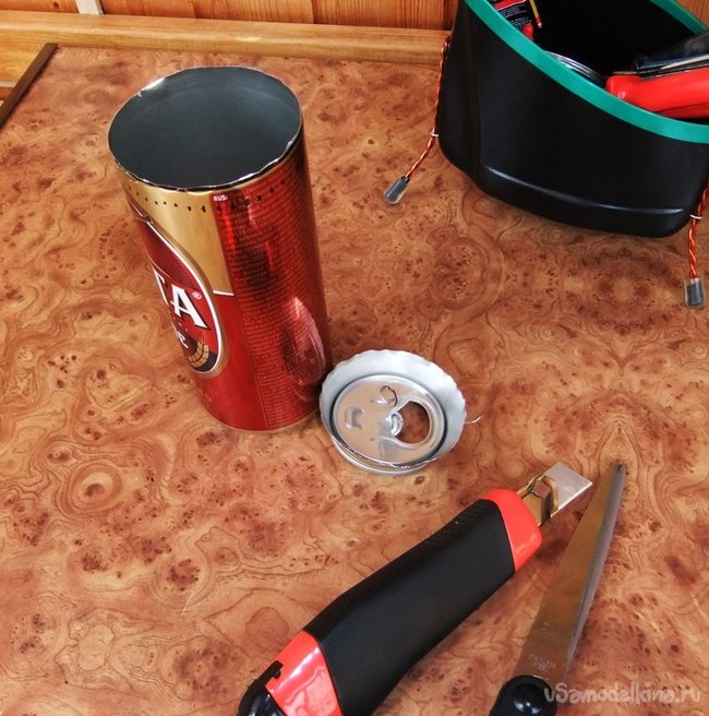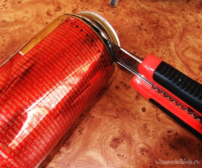 Поделка получается красивая, легкая, но работа с ней кропотливая. Расходов при этом никаких нет, кроме пустой пивной баночки и потраченного времени. Из инструментов только портновские ножницы,нож и щелевидная отвертка (можно сделать подобие ее самому). Первым делом острым ножом отрезаем горловину баночки.