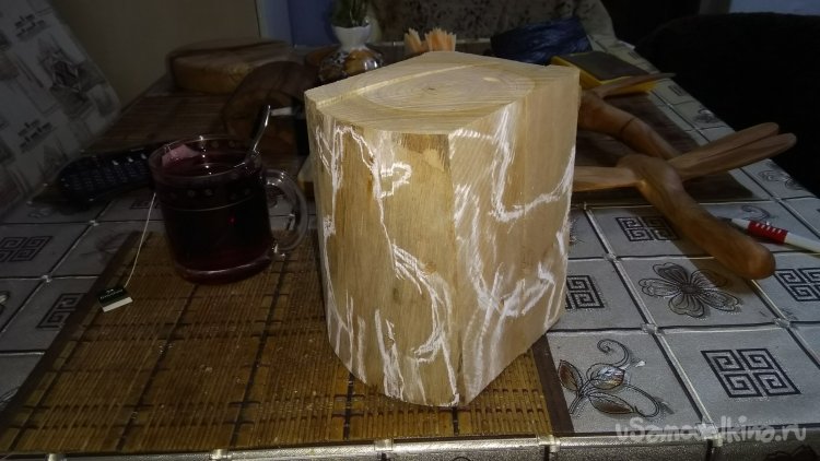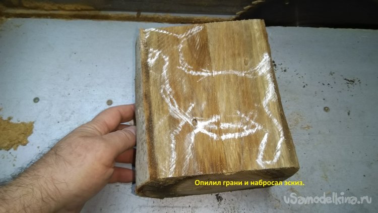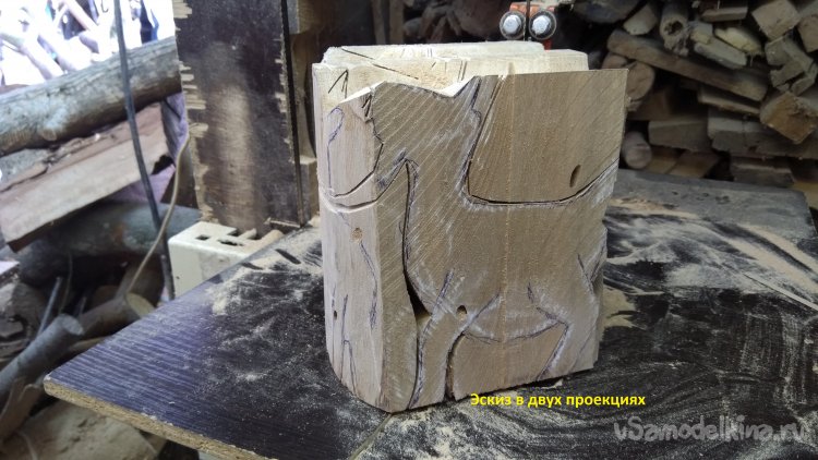 На циркулярке отпилил часть ветки, окорил и опилил грани. Сначала мелом набросал эскиз того, что я хочу сделать. Потом подправил авторучкой шариковой и приступил к выпиливанию. Пилил на самодельной ленточной пиле. Эвкалипт свилеватый и при глубоких пропилах полотно нельзя вернуть назад, так как пропил просто смыкается под действием напряжений внутренних в древесине. Поэтому надо использовать клинышки для предотвращения сжатия пропила. По мере пиления они могут и вывалиться, но чаще их зажимает так, что приходится вторым клином расширять пропил для возврата полотна. Я ведь не допиливаю до конца, чтобы заготовка не развалилась, удерживать скотчем не всегда получается, надо его постоянно добавлять, компенсируя новые пропилы, проще не допилить, потом достаточно легко ненужные части отламываются или отпиливаются в противоход основному пропилу.