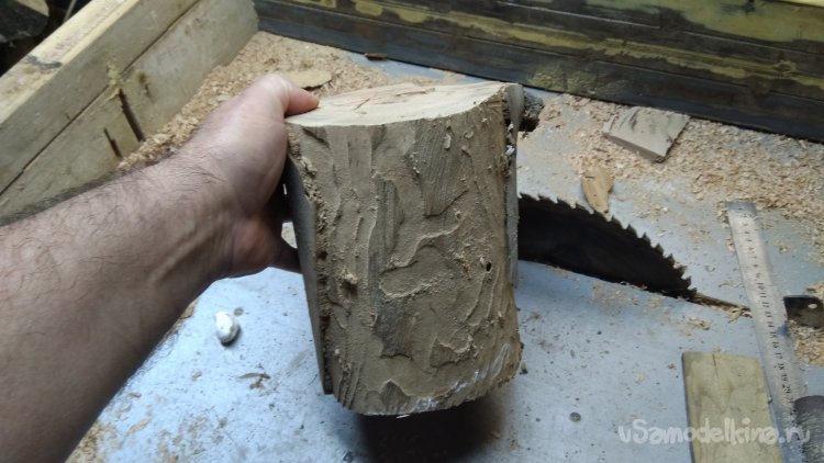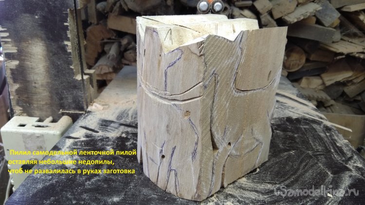 Пилил самодельной ленточной пилой оставляя небольшие недопилы, чтоб не развалилась в руках заготовка.