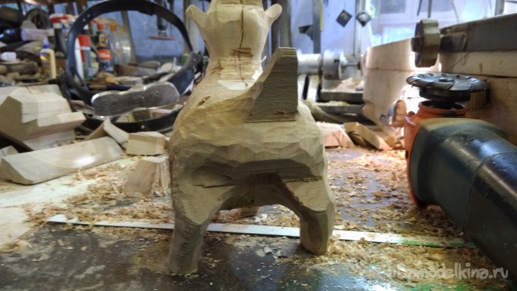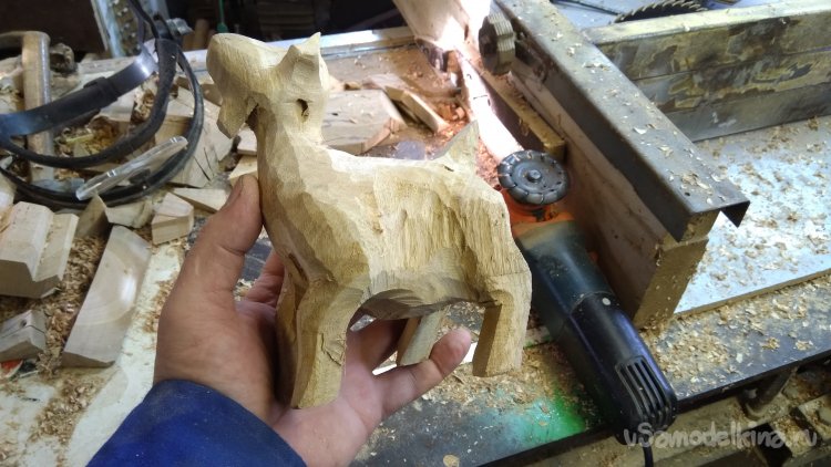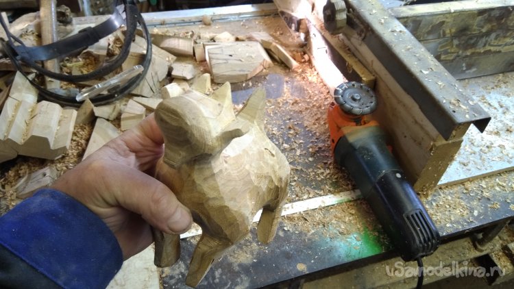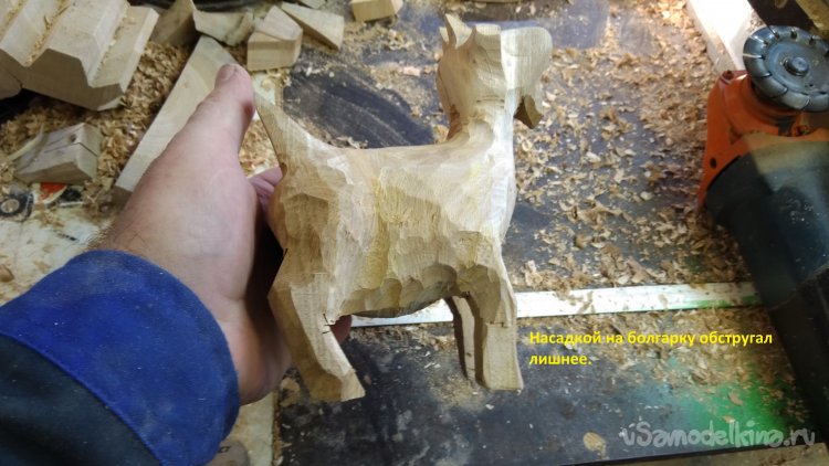 После выпиливания основных линий, разбираю заготовку. Строгальной насадкой на болгарку стёсываю грубо фигурку.