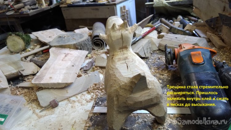 Трещина всё больше. Внутри древесина сырая, а снаружи стремительно усыхает, до ещё я снимаю материал, вот её и распирает изнутри.