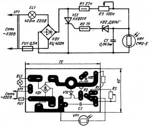 Светодиод HL1 сигнализирует о работе реле и помогает при настройке порога срабатывания реле. C помощью резистора R2 устанавливается момент включения светодиода при пороговом освещении.