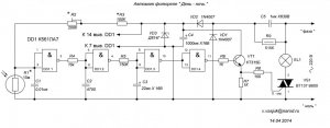 Для решения этой проблемы вводят гистерезис. То есть своего рода зазор между переключениями из одного состояния в другое, что достигается введением положительной обратной связи через резистор R9 для каскада на ОУ DA1.1 так называемый триггер Шмитта. В данной схеме доля выходного электрического сигнала ОУ поступает на прямой вход и устанавливает уровень, при котором схема будет переключаться. Кроме того, положительная обратная связь обеспечивает быстрое переключение выхода независимо от скорости изменения входного колебания. На ОУ DA1.2 выполнен второй триггер Шмитта, который вместе с интегрирующей цепью R10, C3 обеспечивает задержку срабатывания реле. Постоянная времени у цепи R10, C3 около 15 секунд, но в сочетании с гистерезисом триггера Шмитта это время увеличивается до 26 секунд. Этим обеспечивается защита от ложного срабатывания при кратковременных засветках в темное время и затенениях в светлое время.
