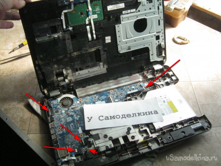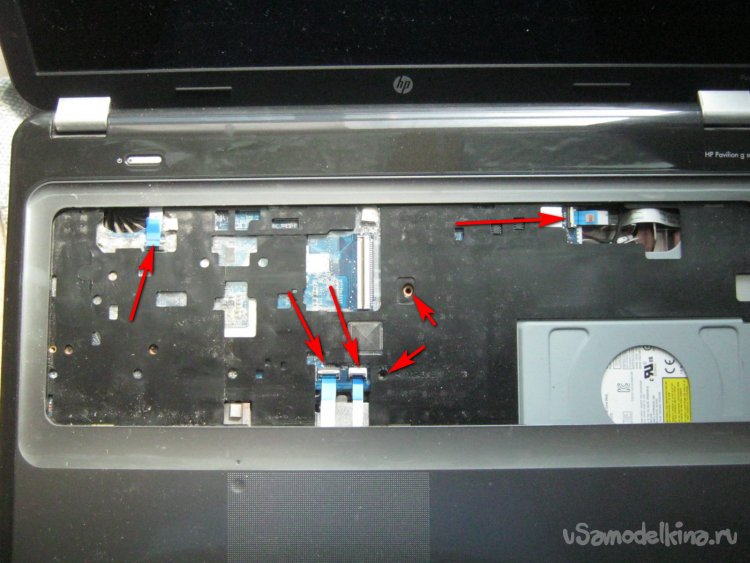 Фото 8. Отсек под клавиатурой. Короткие стрелочки – винты крепления, стрелочки подлиннее – шлейфы. Отсоединяются аналогично клавиатурному (Фото 7).