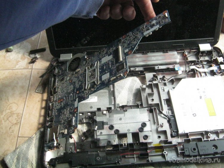 Фото 11. Извлечение отсоединенной материнской платы. Приподнимаем узкий край и вытаскиваем широкий – гнезда из пазов на боковой стенке.