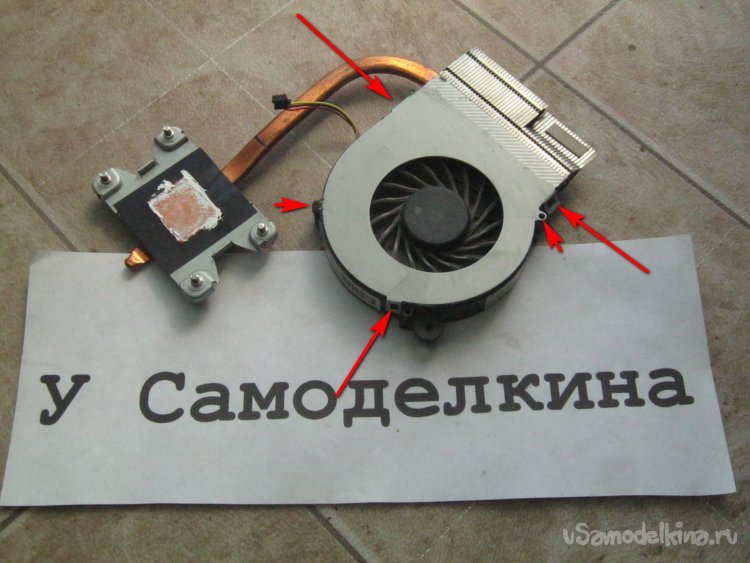 Фото 12. Система охлаждения, добрались! Нашлепка с четырьмя подпружиненными винтиками – теплоприемник на процессоре, через кривую тепловую трубку, тепло уходит к обдуваемому радиатору-расческе. В нем все дело.