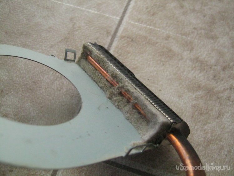 Фото 14. Вуаля! - причина перегрева – уплотненный слой пыли, напоминающий войлок. Какая уж тут эффективность. Все это счастье удаляем пинцетом, микрорадиатор, это недоразумение, тщательно продуваем сжатым воздухом с одной и с другой стороны.