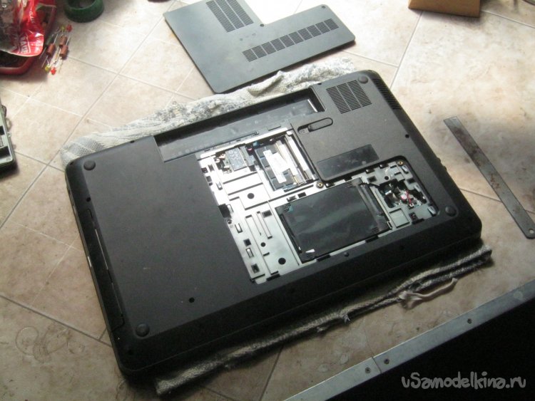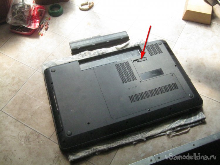 Перед работой не повредит раздобыть кусок чистой ветоши для подкладки, чтобы не покарябать пластиковые панели прибора. Компьютер выключаем, складываем и переворачиваем вверх дном. Подпружиненной защелкой извлекаем аккумулятор прибора. Для отсоединенных деталей организуем некое чистое ровное место изолированное от детей, футбольных мячей, домашних животных и прочих форс мажорных факторов. Под руку, лучше чтобы тоже не совались.