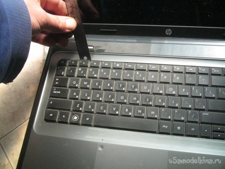 Фото 5. Извлечение клавиатуры. Теперь держится на пластиковых защелках. Применяем тупой плоский инструмент, линейки пришлось задействовать две. На себя не тащить – снизу жесткий, короткий и широкий шлейф.