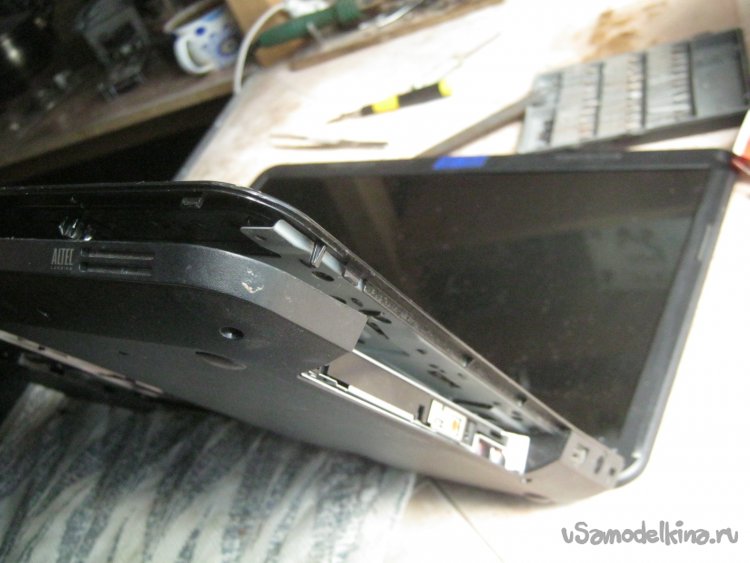 Кладем открытый компьютер на крышку-монитор или ставим его набок и открываем половинки корпуса. Кроме винтиков, к этому моменту всех до единого открученных, половинки также соединены пластиковыми защелками – снова применяем тонкий-плоский инструмент. Фабричный или импровизированный. Лучше парочку.