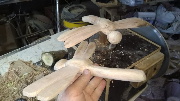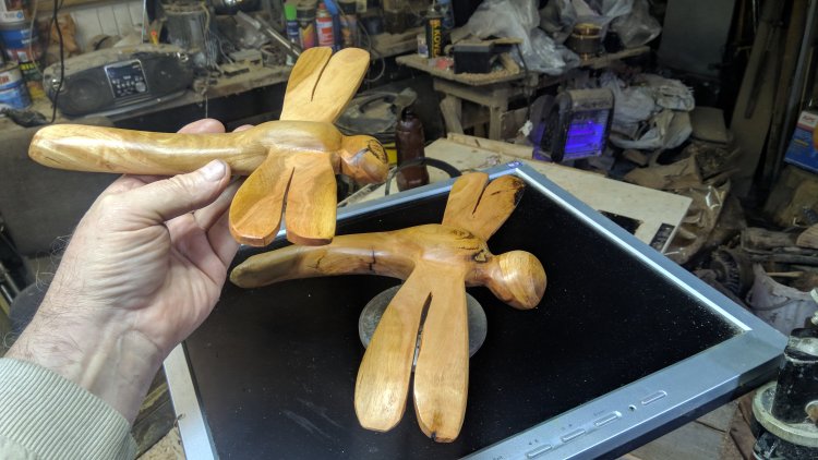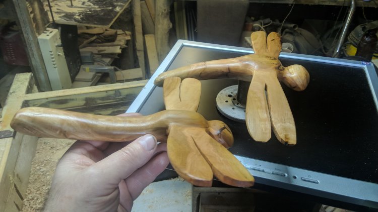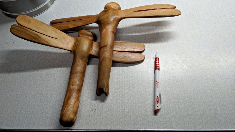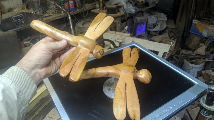 Но однако попытался спасти проект, и вот что их этого вышло. Что крайне удивительно. Из этого бросового материала. Ещё и запорченного мной, удалось выкроить аж две стрекозы! Строгание и пиление, шлифовка и полировка, прорисовка и перерисовка в результате дали плоды ))