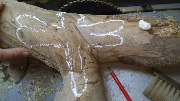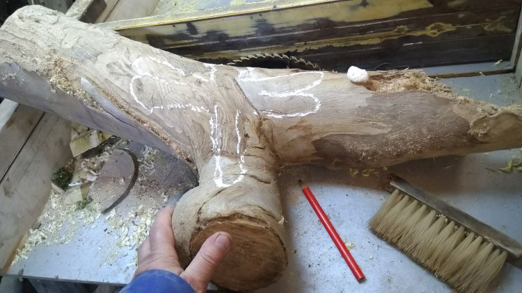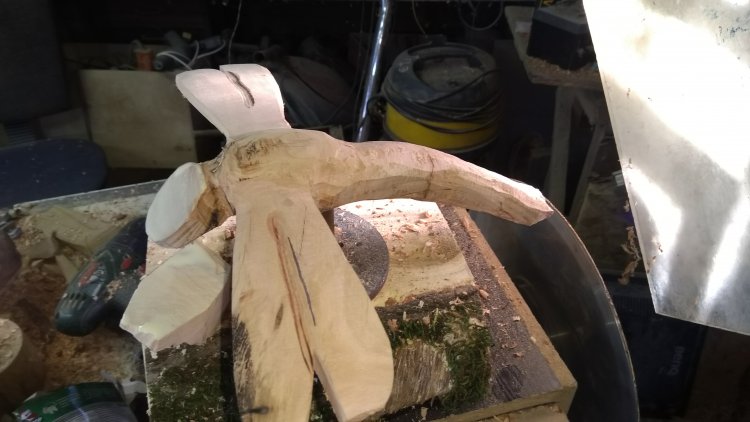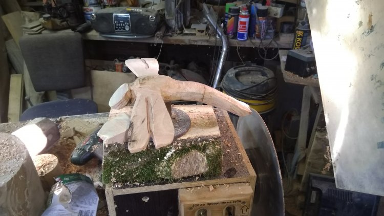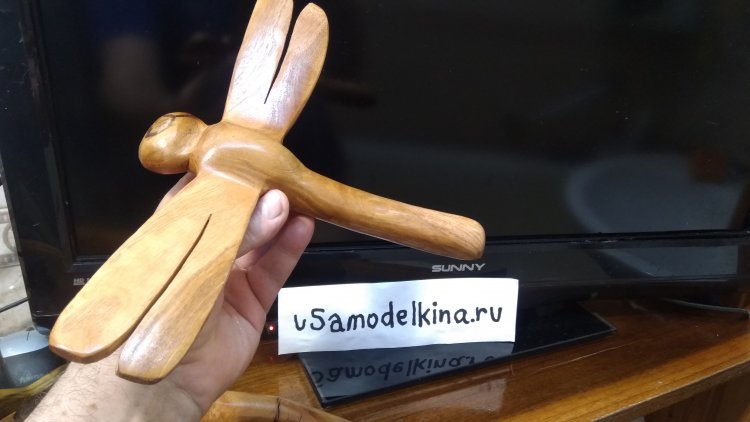 Мелом на ветке набросал контуры стрекозы и стал пилить. Внутри ветки оказалась пустота, ещё и электропилой я заехал за контуры, ну в общем настроение было потеряно. Проект был близок завершиться в печке, там неважно, горит всё, и пропиленное и недопиленное.