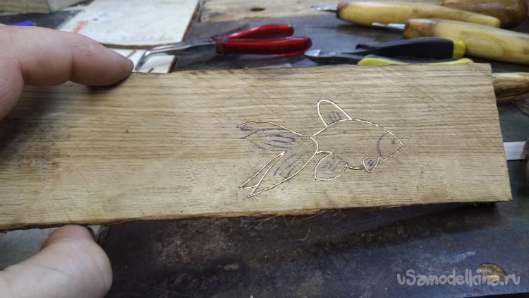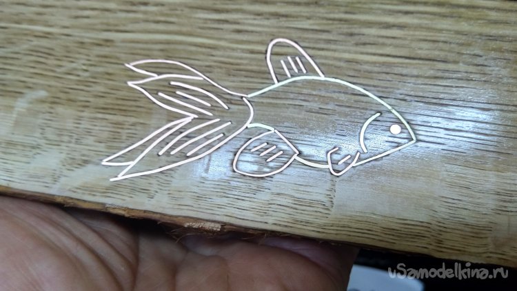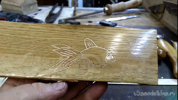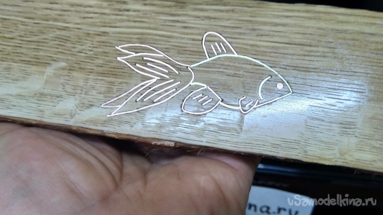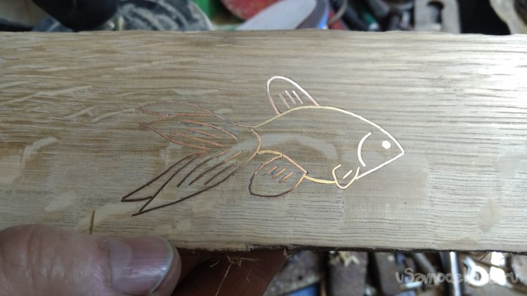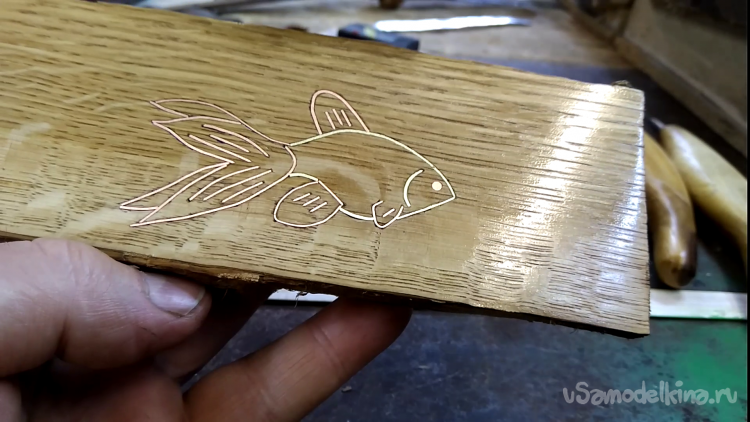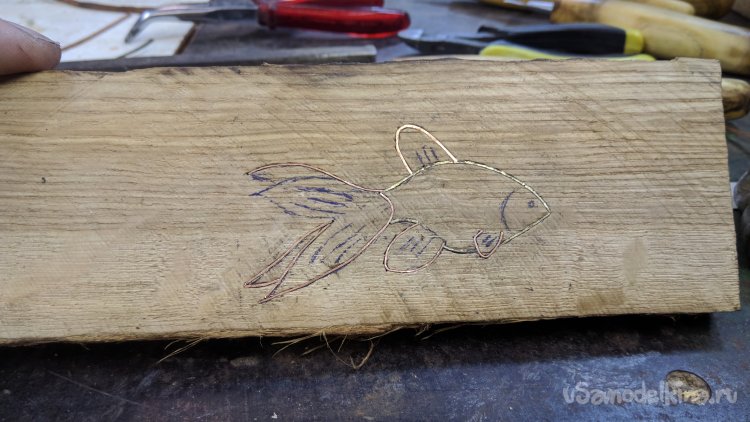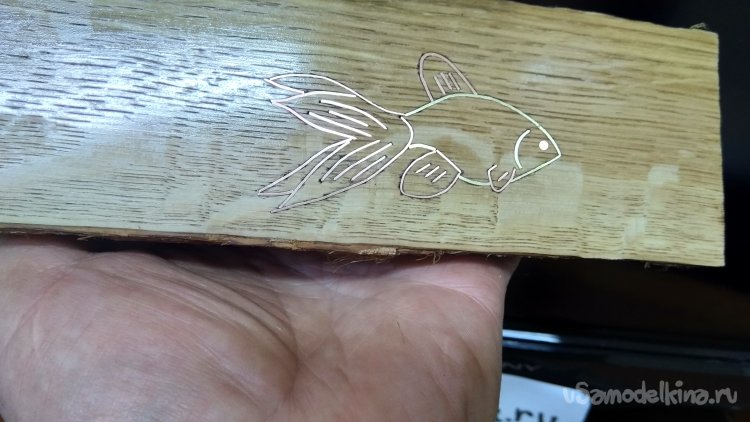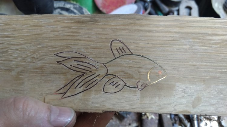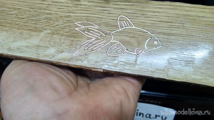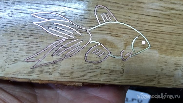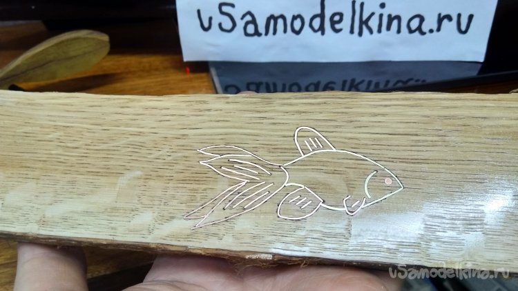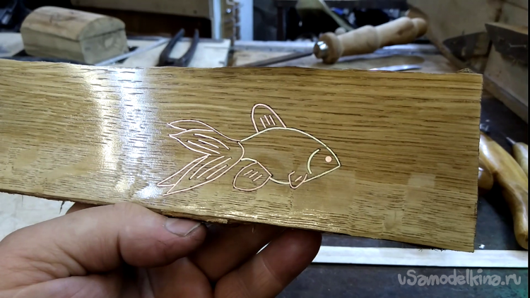Но это я всё об инструменте, но без него думаю такие штучки невозможно сделать, а сделал я на дубовой дощечке вот такую рыбку. Делал для пробы резцов и наработки навыков в инкрустации.
