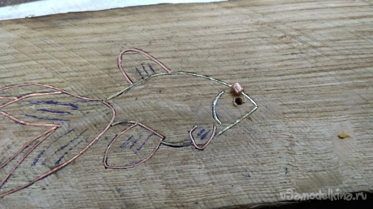 Медную полоску изгибаю по форме прорезанного паза, потом придерживая пинцетом забиваю полоску молотком в дерево.