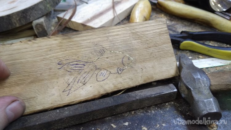 Для инкрустации я прорезаю в дереве пазы 2,5 – 3 миллиметра глубиной. Инкрустацию делаю без клея. Только за счёт сил трения держатся там полоски латуни или меди. Это как топор застрявший в дереве, только там обычно вдоль волокон, а при инкрустации как получится, и вдоль волокон и поперёк, следуя рисунку.