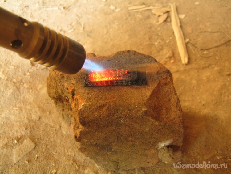 Фото 8. Грязь с сетки выжег низкотемпературной, пропан-воздушной компактной горелкой. Сетка на кирпичике, операцию удобнее проводить в защищенном от ветра месте, в полумраке. Сетка нагревается до красного каления. После остывания, оставшийся нагар, с металла легко соскребается ножом.