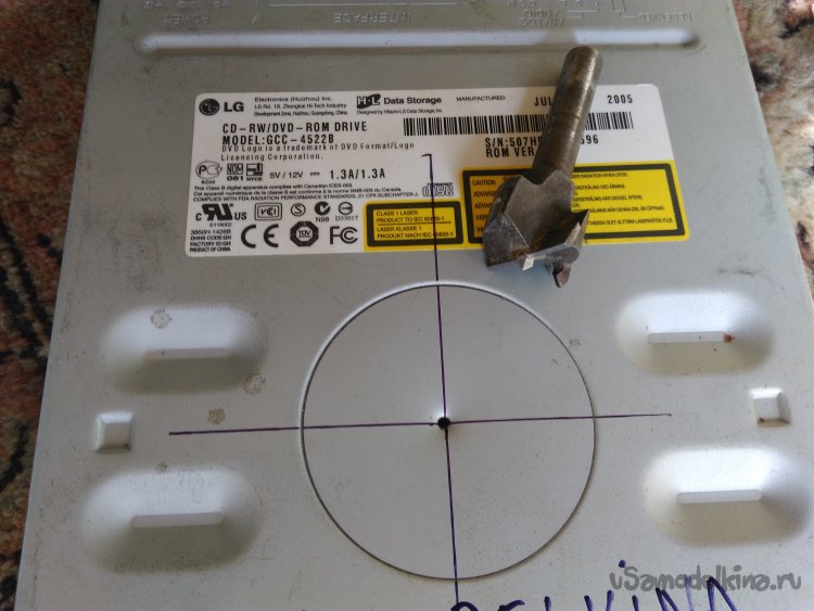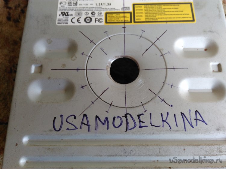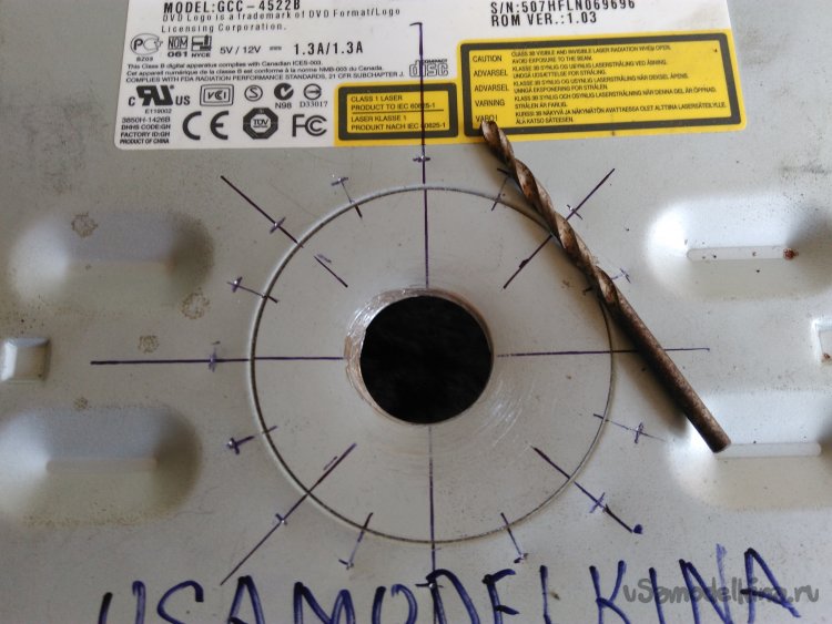 Теперь на крышке где был прижимной диск (там уже есть четкий круг), расчерчиваем и находим центр, керним-чтоб фреза не убегала.