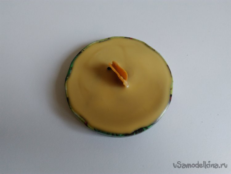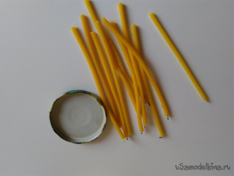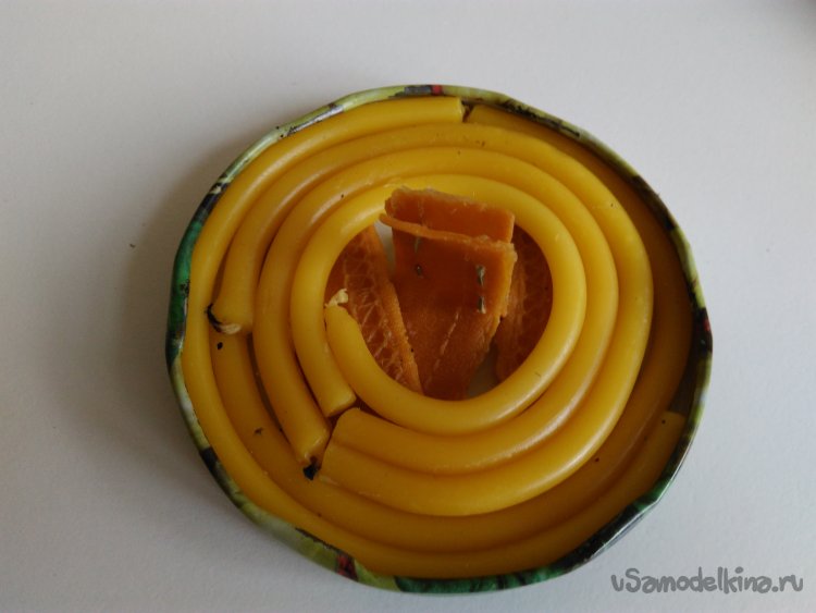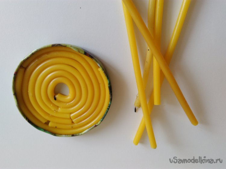 Сначала немного разогрев свечи, уложил их спирально в крышку. Теплые свечи очень даже пластичные, тут у вас проблем не будет.