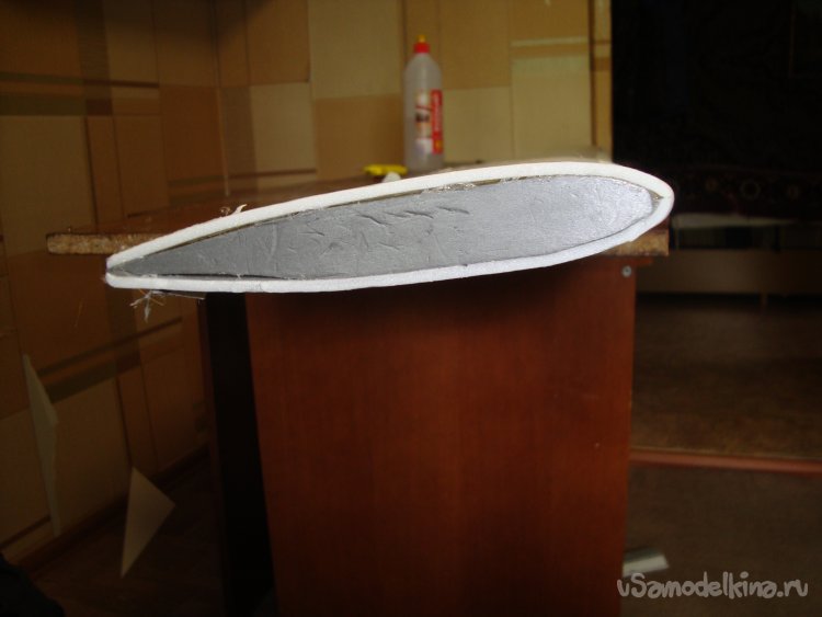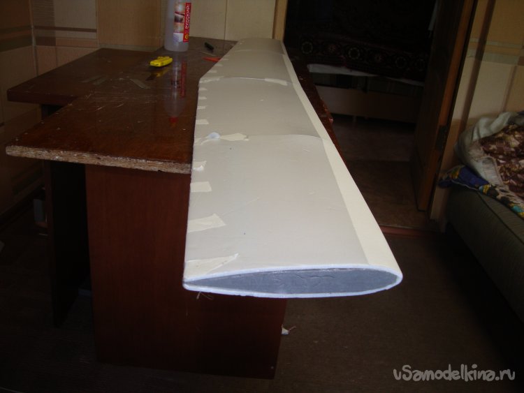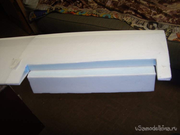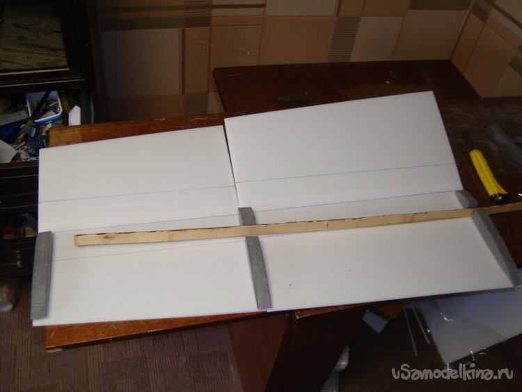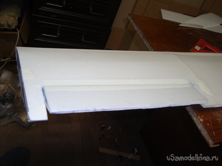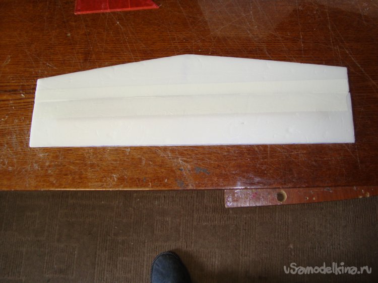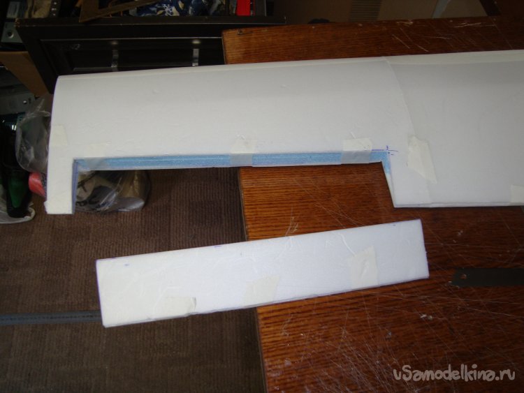 В местах, где будут вырезаться элероны, вклеил полоски подложки под ламинат, подогнав их по толщине элеронов.