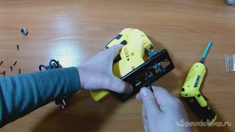 Далее с помощью шестигранника откручиваем 2 винта и снимаем подошву лобзика.