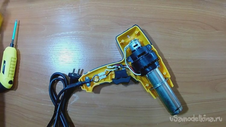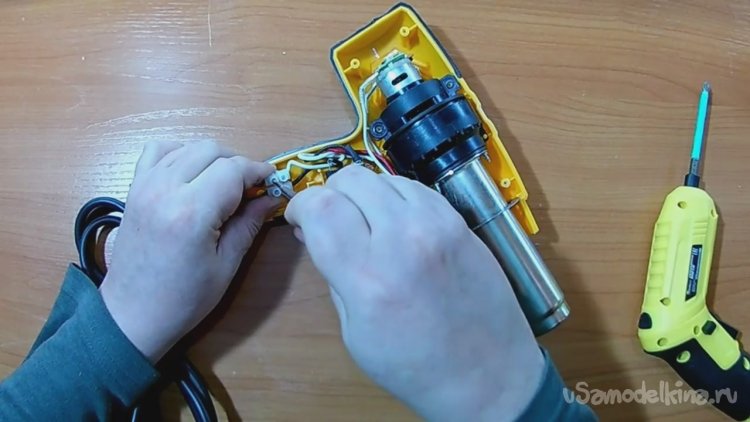 Провод в фене фиксировался с помощью винтового клеммника. Отсоединил его.