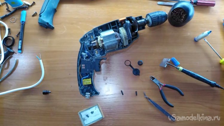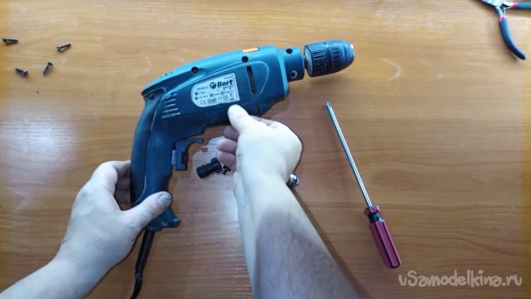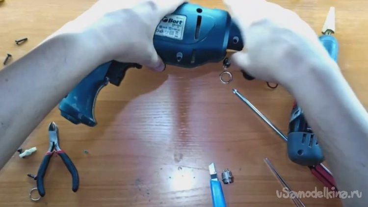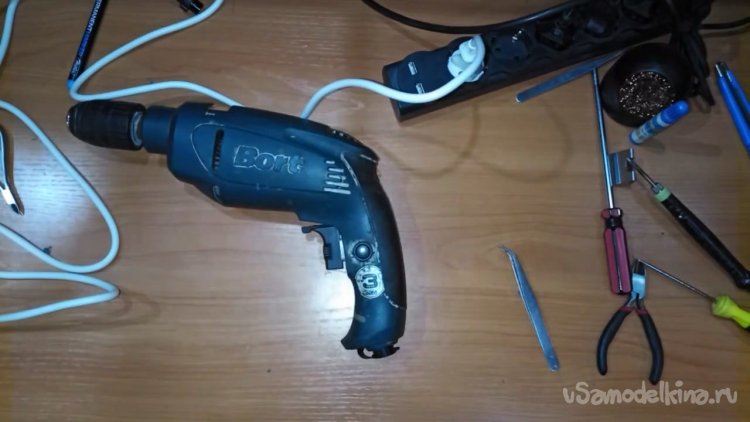 Начал свой путь переделывания с моей многострадальной дрели Bort. Что только она не повидала в своей жизни, и плавала в растворе, и падала с лесов с высоты 3 метров, и кнопку менял... В общем пациент подходящий.