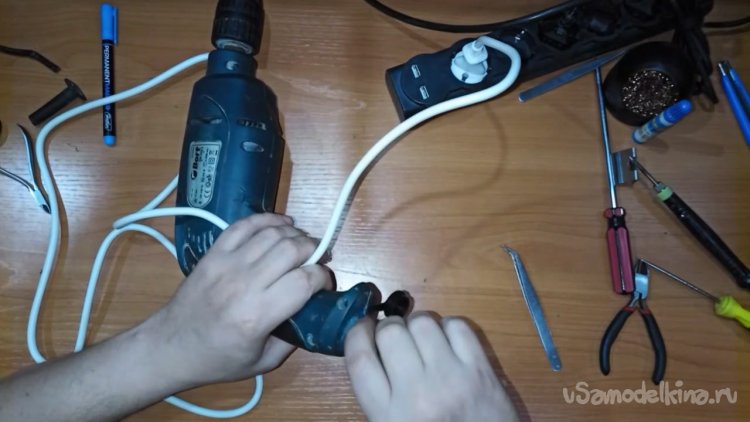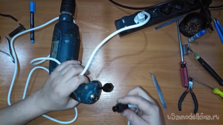 После того, как высверлил отверстие нужного диаметра под разъём, открыл дрель, подготовил провода для пайки (зачистил, залудил, накинул кембрики).