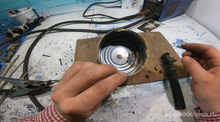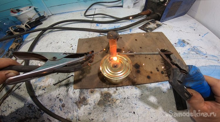 Как же варить? Плотно прижимаем гвоздь к банке, если сделать зазор, в месте сварки на банке будет шлак. Ну а далее варим, как только гвоздь начинает "расплываться" по банке, электрод отрываем, ну или двигаемся дальше.